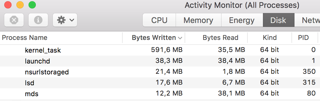 Activity monitorban 1 kernel_task van, ami magasabb értéket mutat a disk és memory füleken: