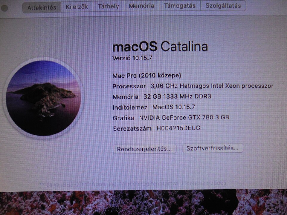 Eladó Mac Pro 5.1 2010 Mid gépem. A rendszer Samsung 240GB SSD-ről indul. Mind a 4 SATA tároló hely használható. Egy db 1TB SATA diszk tartozik a géphez. Telepítve vannak hang és videó szerkesztő programok és több hasznos applikáció is. Paraméterek a mellékelt képeken láthatók. Érdeklődés esetén az árról megbeszélés szerint megállapodhatunk.